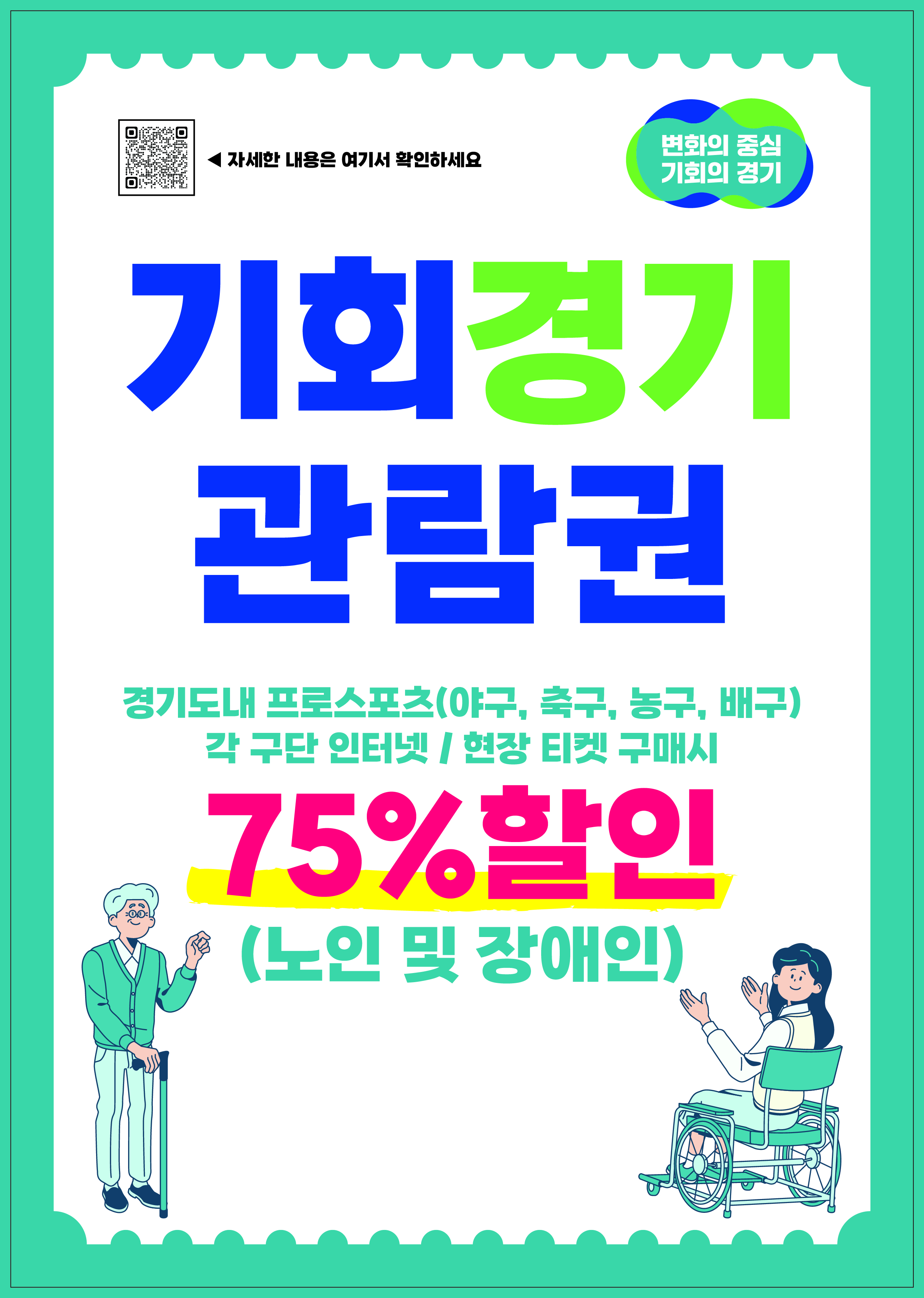 경기도에 거주하는 70세 이상 본인과 등록 장애인 및 동반1인에게 경기아트센터 레퍼토리 시즌 공연 관람료의 75%를 할인해 준다고 하니 미리 확인하시고 관람료 할인혜택을 받으세요.