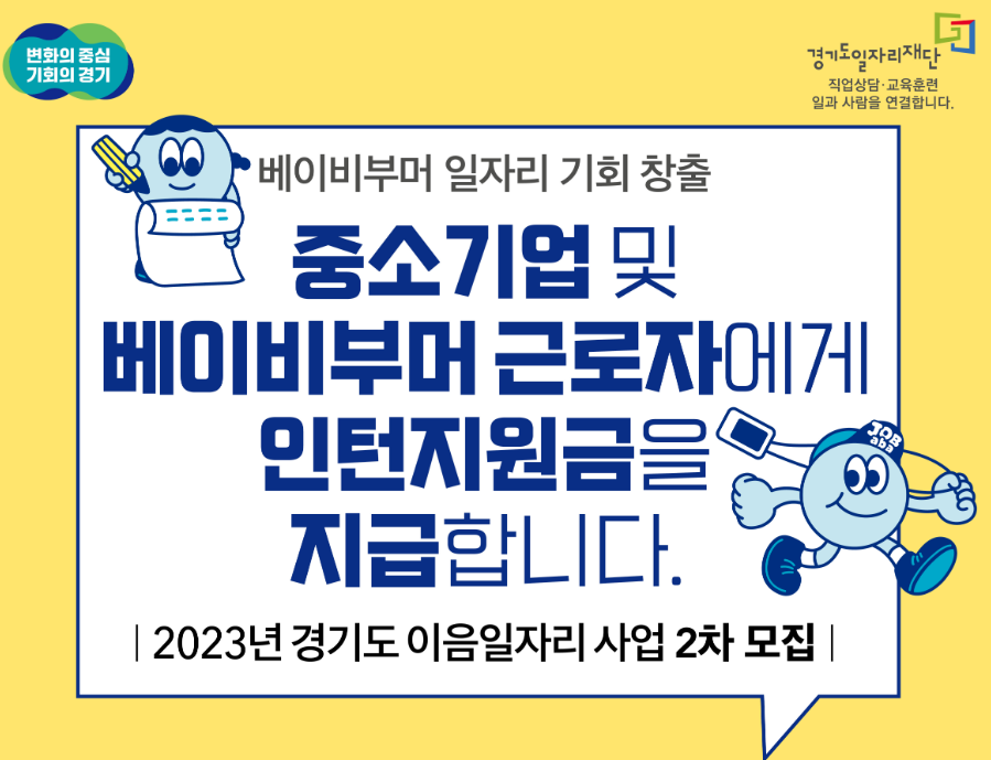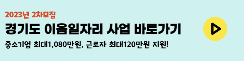 2023년 경기도 이음일자리 사업은 중소기업에 최대 1,080만원, 베이비부머 근로자에 최대120만원을 지원해 주는 사업이에요. 기업과 근로자가 동시에 지원받는 혜택만점 사업입니다. 참여자(신규 근로자)는 공고일 기준 만40세 이상 만65세 미만인 미취업자가 대상이며 기간 내 충원시 조기 마감된다고 하니 확인하시고 바로 신청하세요.